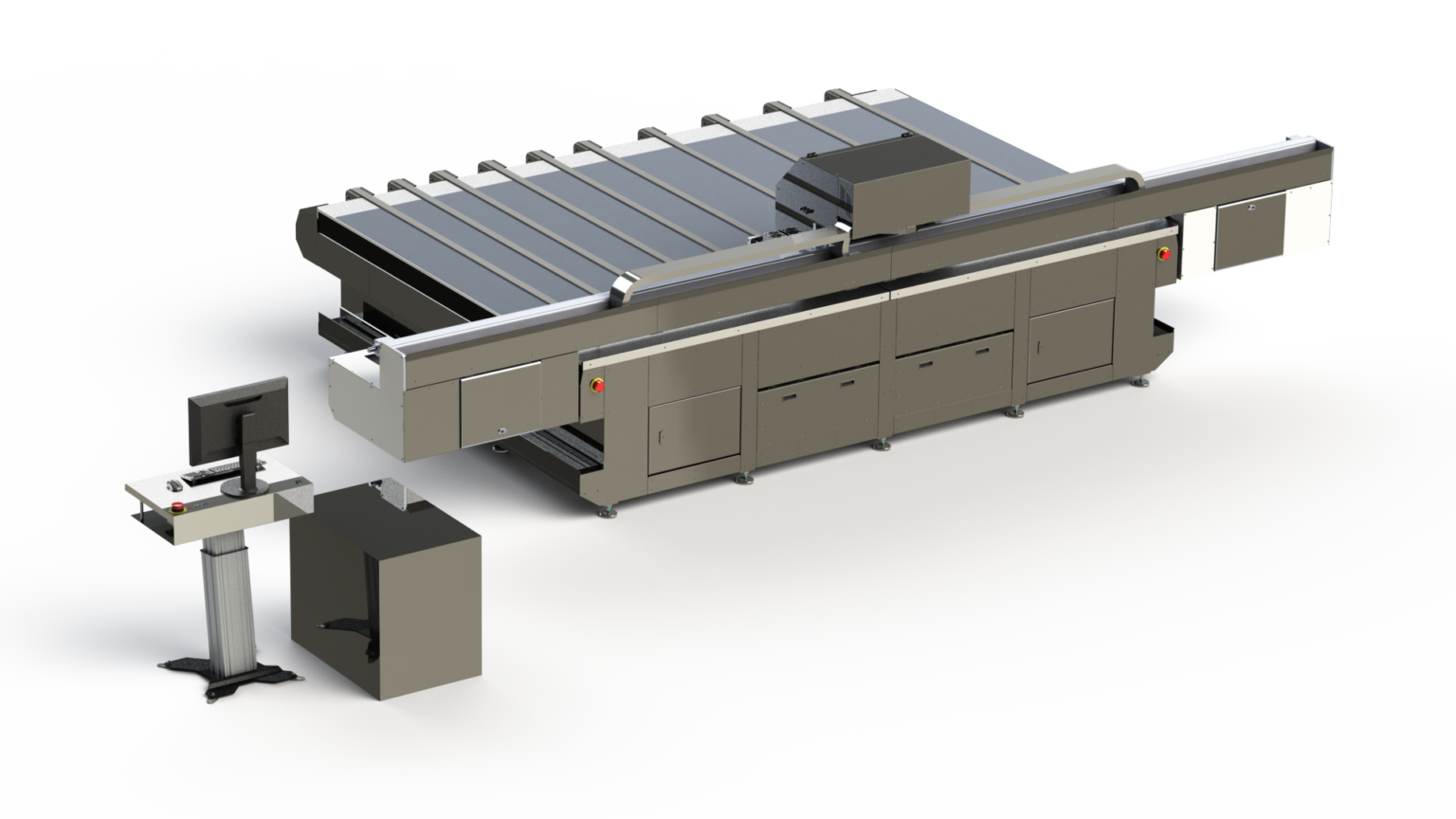 HIGH TECH DIGITAL INKJET PRINTING MACHINE DESIGNED FOR VERY FAST PRINTING ON FLAT WOODEN, PLASTIC, PAPER AND OTHER PLATES MODIFIED TO SPECIFIC REQUIREMENTS ON DIMENSIONS OF THE CUSTOMER.